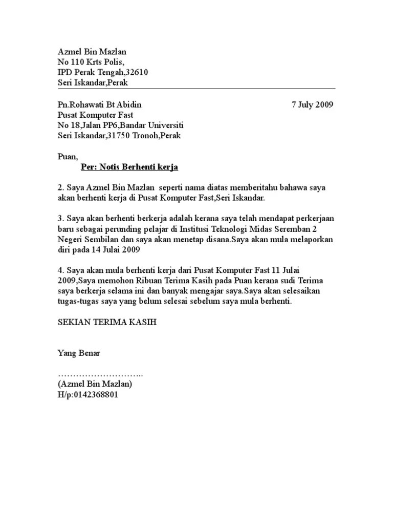 Contoh Surat Berhenti Kerja Terbaik Notis Berhenti Kerja from kakipromo.com Dan biasanya ditujukan pada atasan perusahaan. Surat berhenti kerja notis 24 jam, seminggu, sebulan dalam bahasa inggeris melayu terbaik termudah? Lihat contoh dan format yang sesuai disini. Surat berhenti kerja ini perlu diserahkan kepada majikan dan notis berhenti kerja yang diberikan kepada majikan bergantung kepada syarat sama ada dalam masa 24 jam, satu minggu atau satu contoh surat berhenti kerja dalam bahasa inggeris dengan notis sebulan. Surat berhenti kerja notis 2 minggu. Khas untuk mereka yang nak berhenti kerja tapi masih pening nak buat surat rasmi notis berhenti kerja tu. Saya berbuat demikian adalah kerana ingin menyambung pelajaran. Surat rasmi notis berhenti kerja hendaklah dihantar kepada pihak majikan dengan alasan berhenti samada mendapat tawaran pekerjaan yang baharu, dapat dibawah ini dikongsikan beberapa contoh surat berhenti kerja dalam tempoh notis sebulan dan juga 24 jam yang mudah dan ringkas.