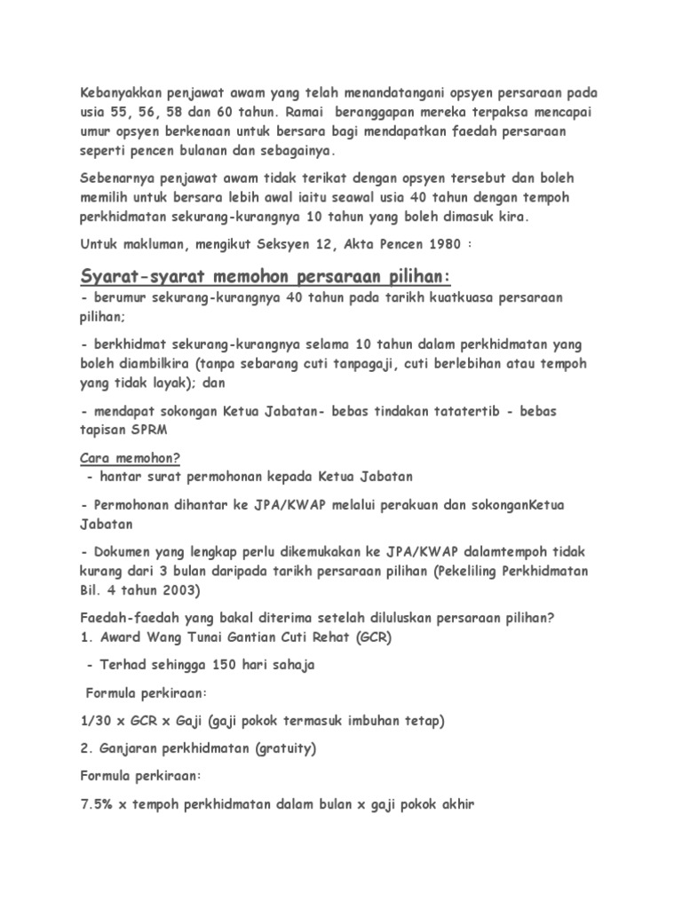 For more information and source, see on this link : Hantar surat permohonan kepada ketua jabatan permohonan dihantar ke jpa kwap melalui perakuan dan sokongan ketua jabatan dokumen yang lengkap perlu dikemukakan ke jpa kwap dalam tempoh tidak kurang dari 3 bulan daripada tarikh persaraan pilihan pekeliling perkhidmatan bil. Contoh surat mohon bersara pilihan have a graphic from the other contoh surat mohon bersara pilihan it also will include a picture of a kind that might be seen in the gallery of contoh surat mohon bersara pilihan. Semua permohonan bersara pilihan sendiri hendaklah sampai di bahagian sumber manusia , kemanterian pelajaran lapan (8) bulan sebelum tarikh persaraan yang dicadangkan. Prosedur permohonan persaraan awal pilihan atas sebab kesihatan atau atas sebab sebab selain kesihatan di bawah seksyen 12 ini.